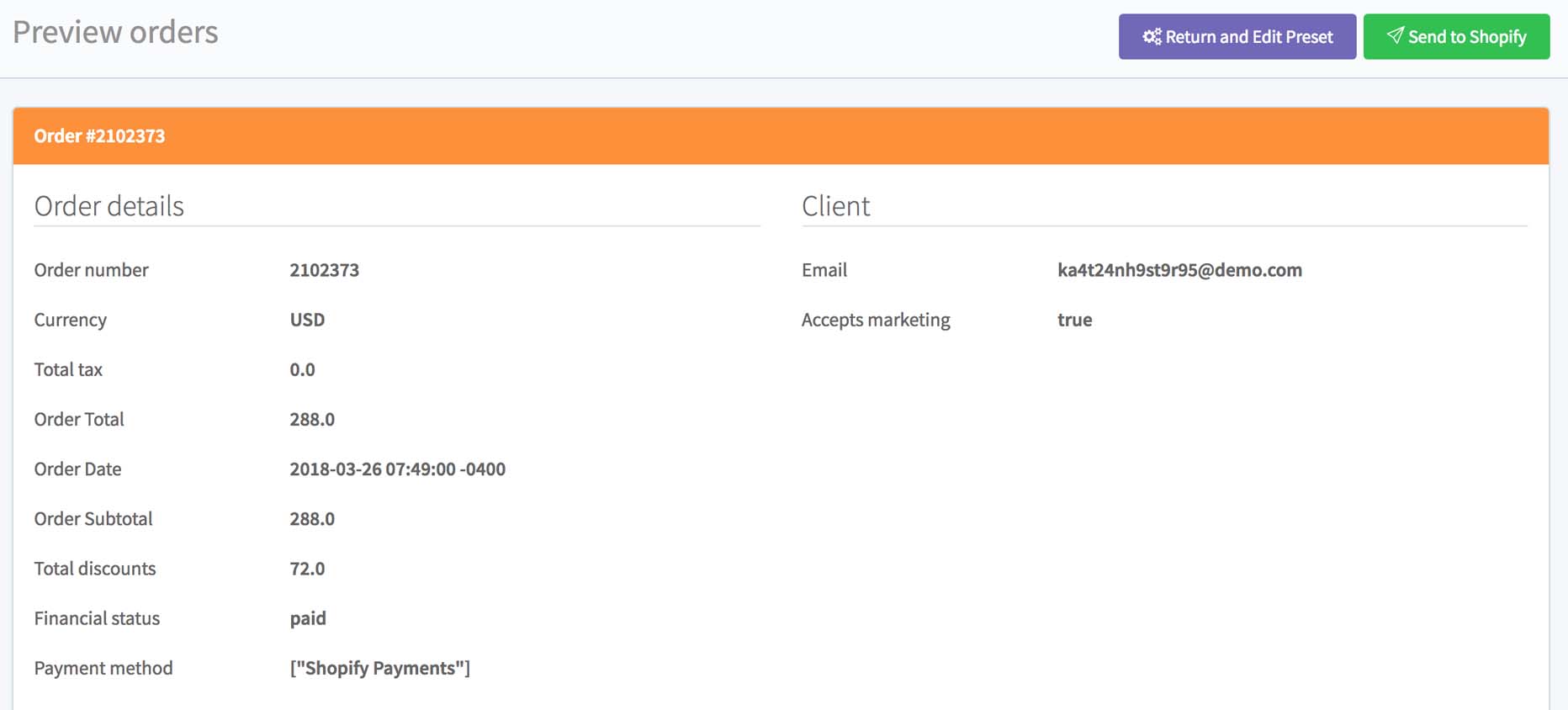 5. Review your field mappings on the “Preview Orders” screen. If the order previews look correct, click “Send to Shopify”